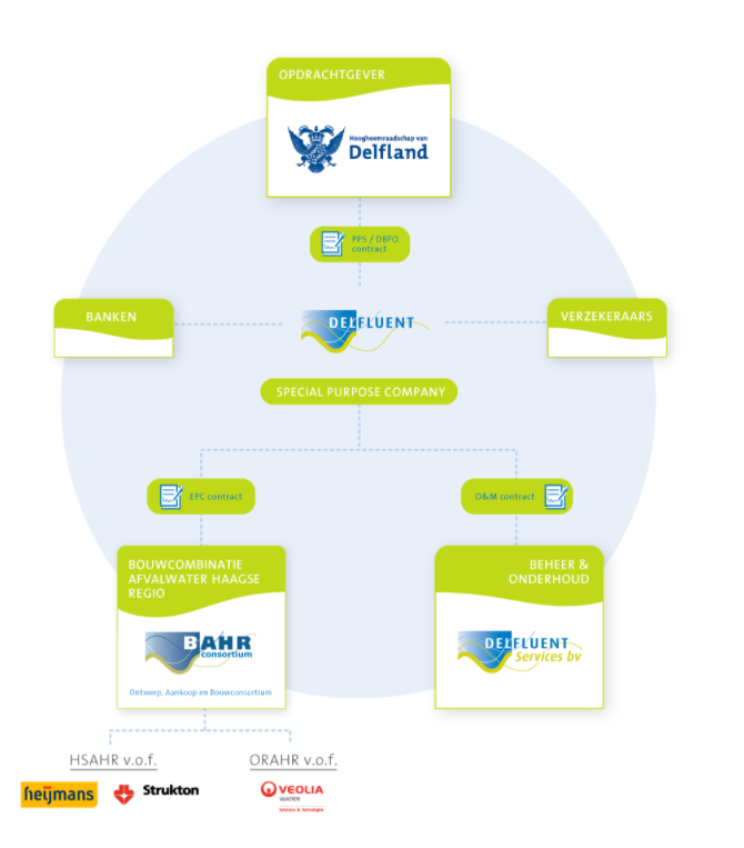 A DBFO-contract was signed between The Delfland Water Board and Delfluent. Delfluent has sub-contracted the design and construction, including the related risks to BAHR through the EPC-contract. The operation and maintenance and all related risks were sub-contracted to DSBV through the O&M-contract.